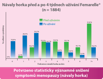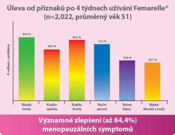 Zdroje: Genazzani A., Nachtigall L., Panay N. & Yoles I. Symposium: 2 Continents, 3 cultures, 4 countries, 2,000 women and FemarelleR; 13th World Congress on Menopause. Rome, Italy June 2011; A prospective study of DT56a (FemarelleR) for the treatment of menopause symptoms